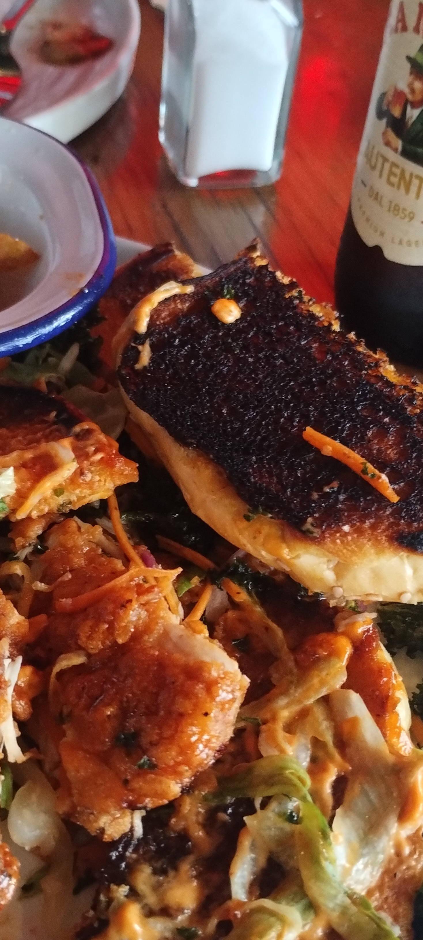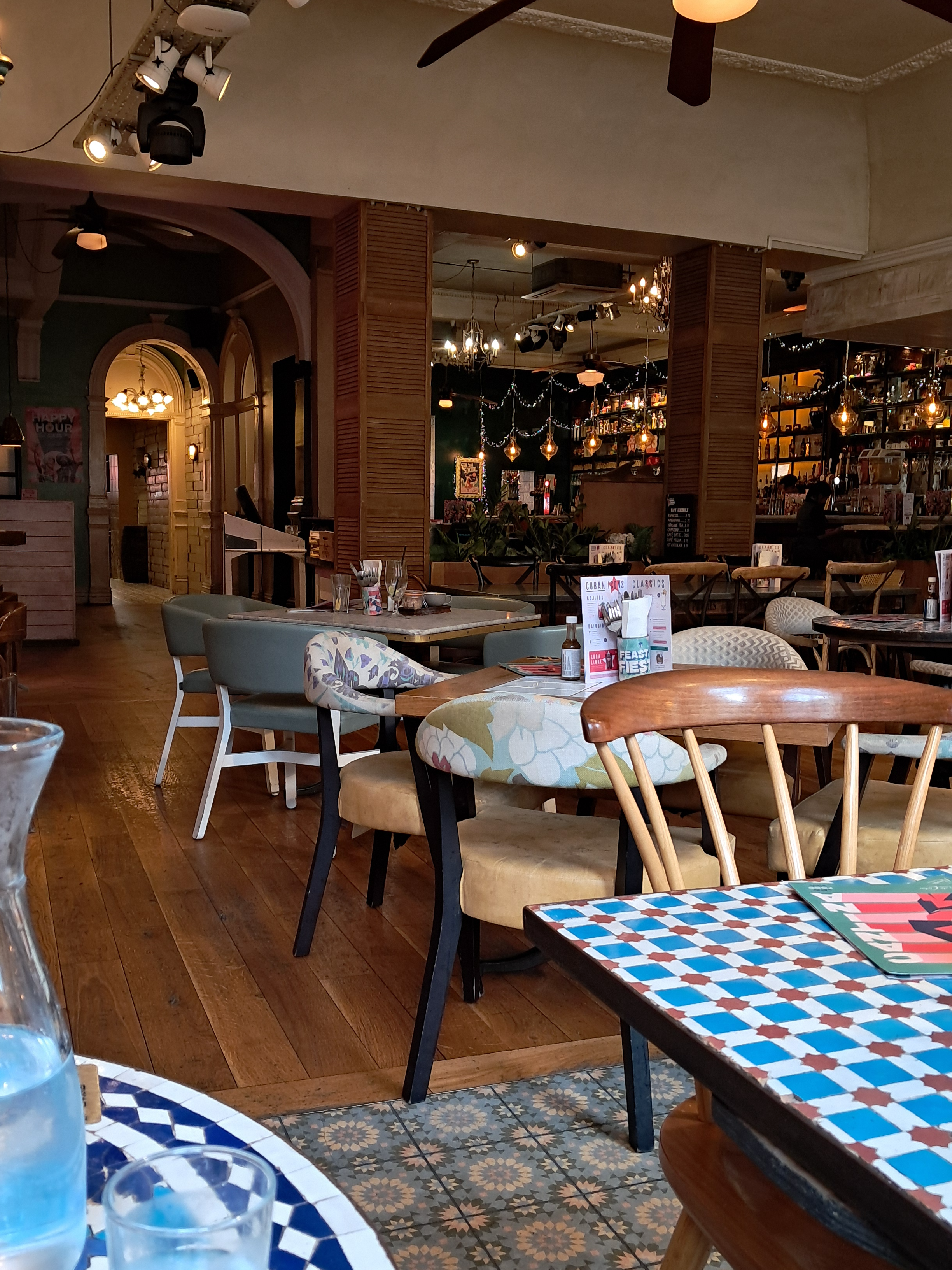 Lots of tapas to choose from, I don't eat cheese but that want problem. Very tasty tapas and 5 was plenty for 2. I had a ginger mojhito, lovely. You could buy more 2 for£10 3pm to 7pm. Great atmospheric building.