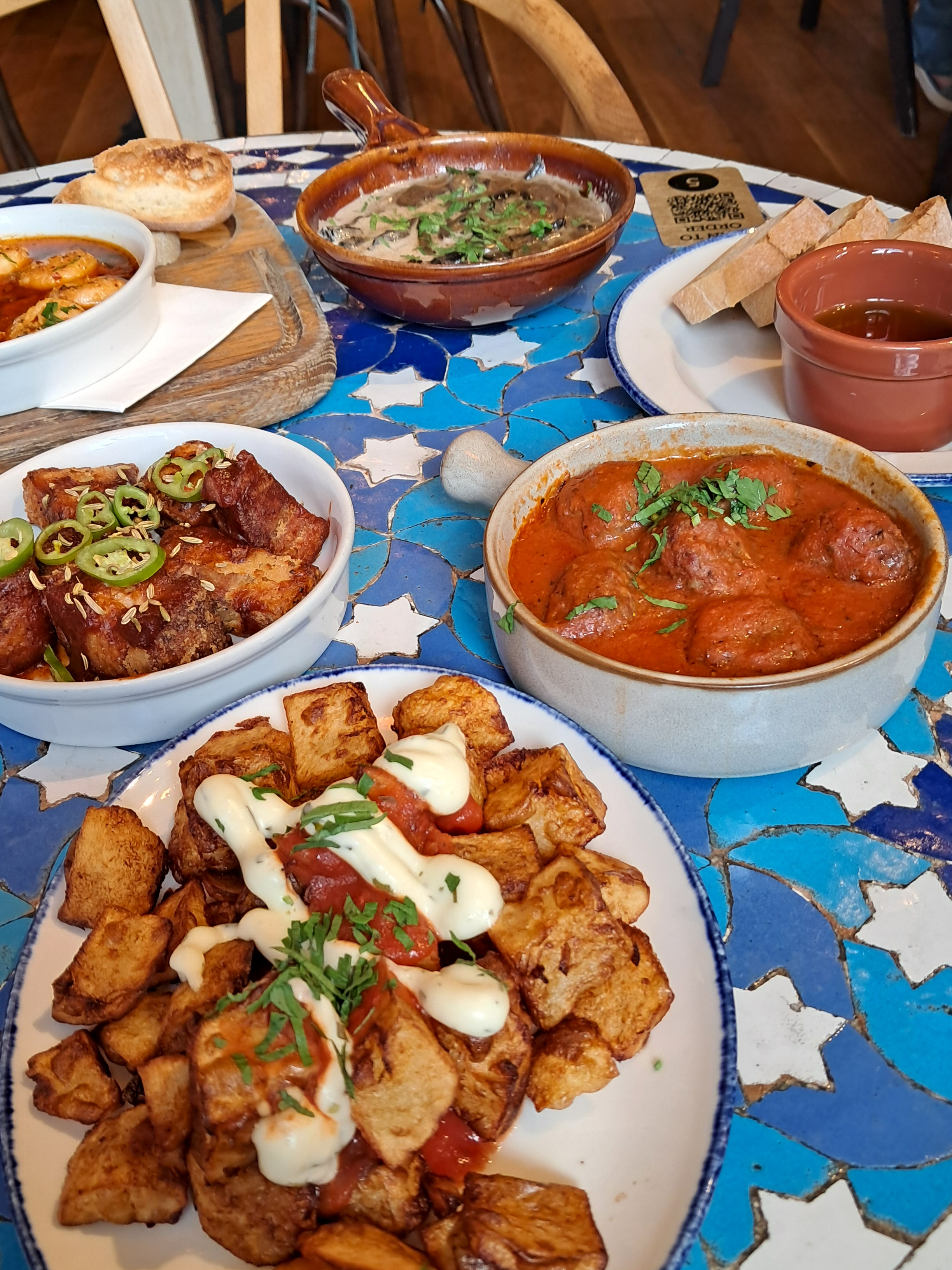 When seated we waited 20 minutes to order and receive drinks We were then given tapas menu and told 4 of them were sold out at 7 pm on a Saturday? 3 of them we were going to order. Then after choosing our 5 got told after 10 minutes 1 of those was also sold out. We stayed night in Cardiff for this experience and it ruined our stay .