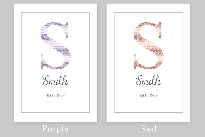 Beneath the letter, the print can be personalised with the surname that will appear in black cursive writing and beneath that the year the family began. The year of establishment can be something that needs to be discovered among ancestors’ birth certificates, or it can be the date that the household began, the year a new family was created through the love of marriage.